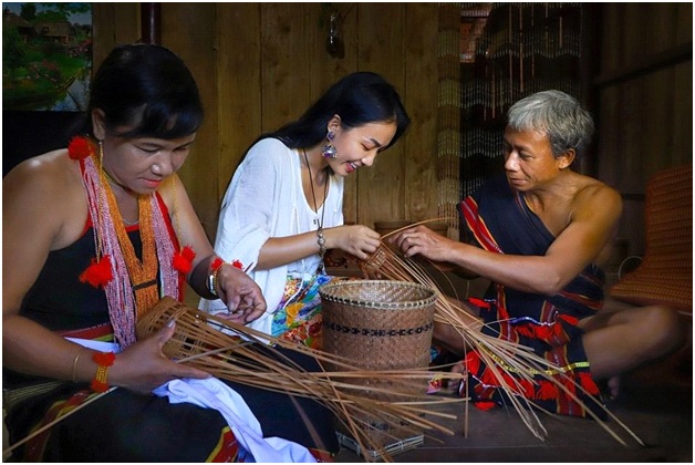 Đồng bào Ca Dong giới thiệu, hướng dẫn du khách nghề đan lát