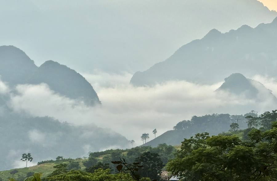 Buổi sáng ở Pù Luông, những đám mây lớn cứ lững lờ, hòa cùng sương sớm ven bản