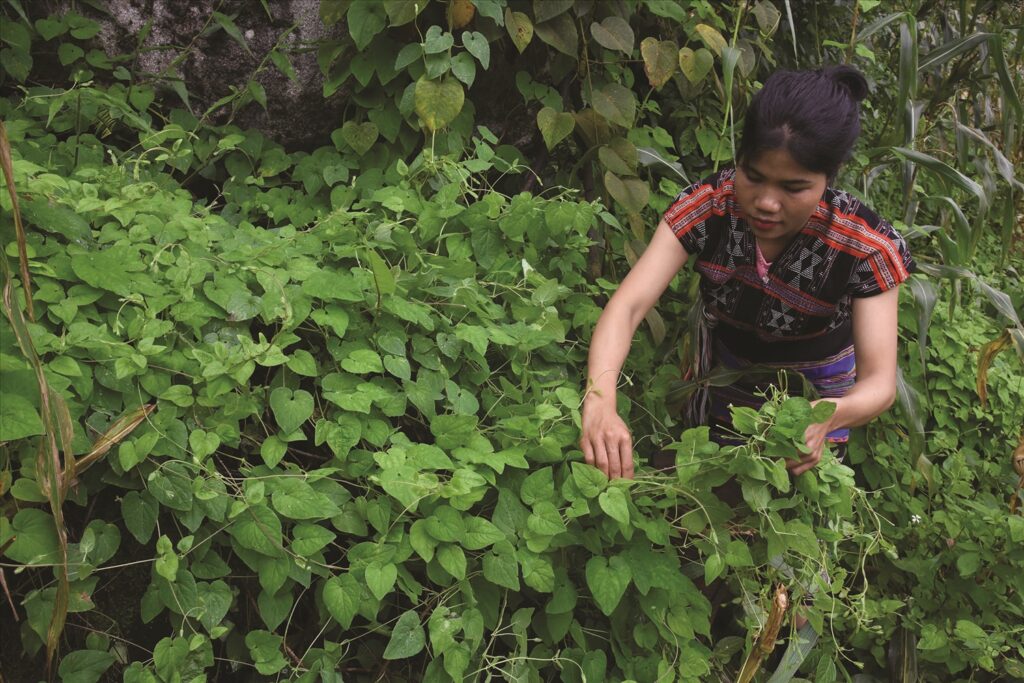 Cô gái Cơ Tu thu hái lá sâm dây để chế biến món ăn.