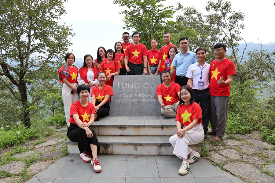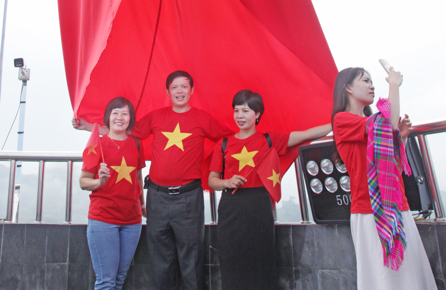 Du khách trải nghiệm chào cờ ngày mới trên đỉnh Lũng Cú. Ảnh: TITC