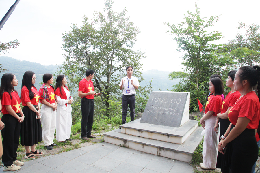 Du khách nghe người kể chuyện trên cao nguyên đá Vương Hà giới thiệu và check-in tại điểm cực Bắc. Ảnh: TITC